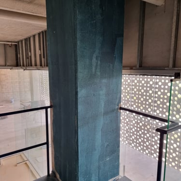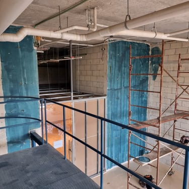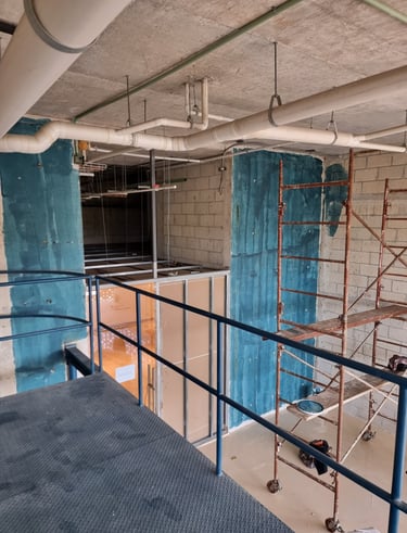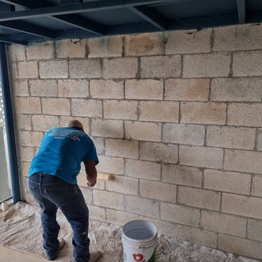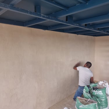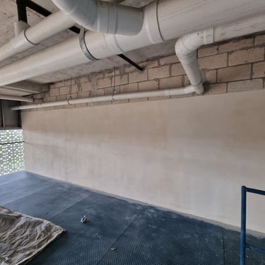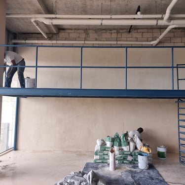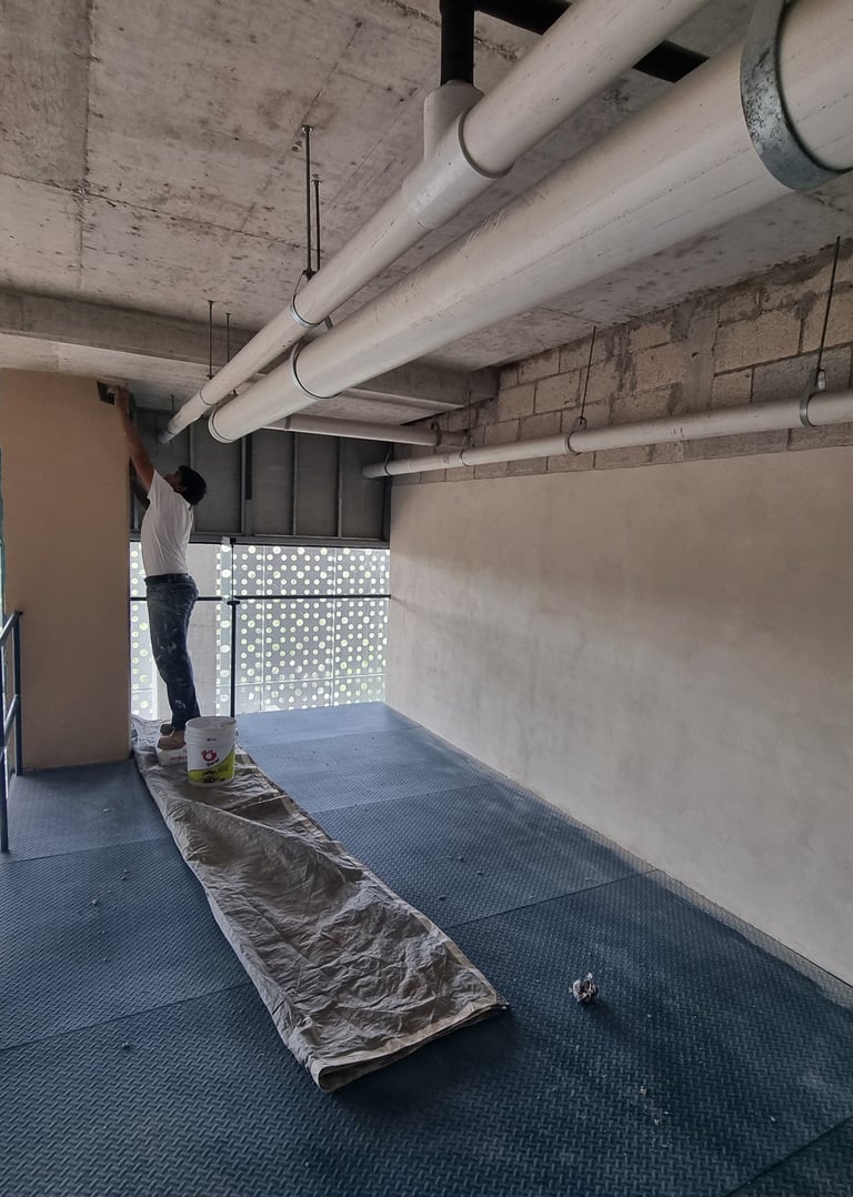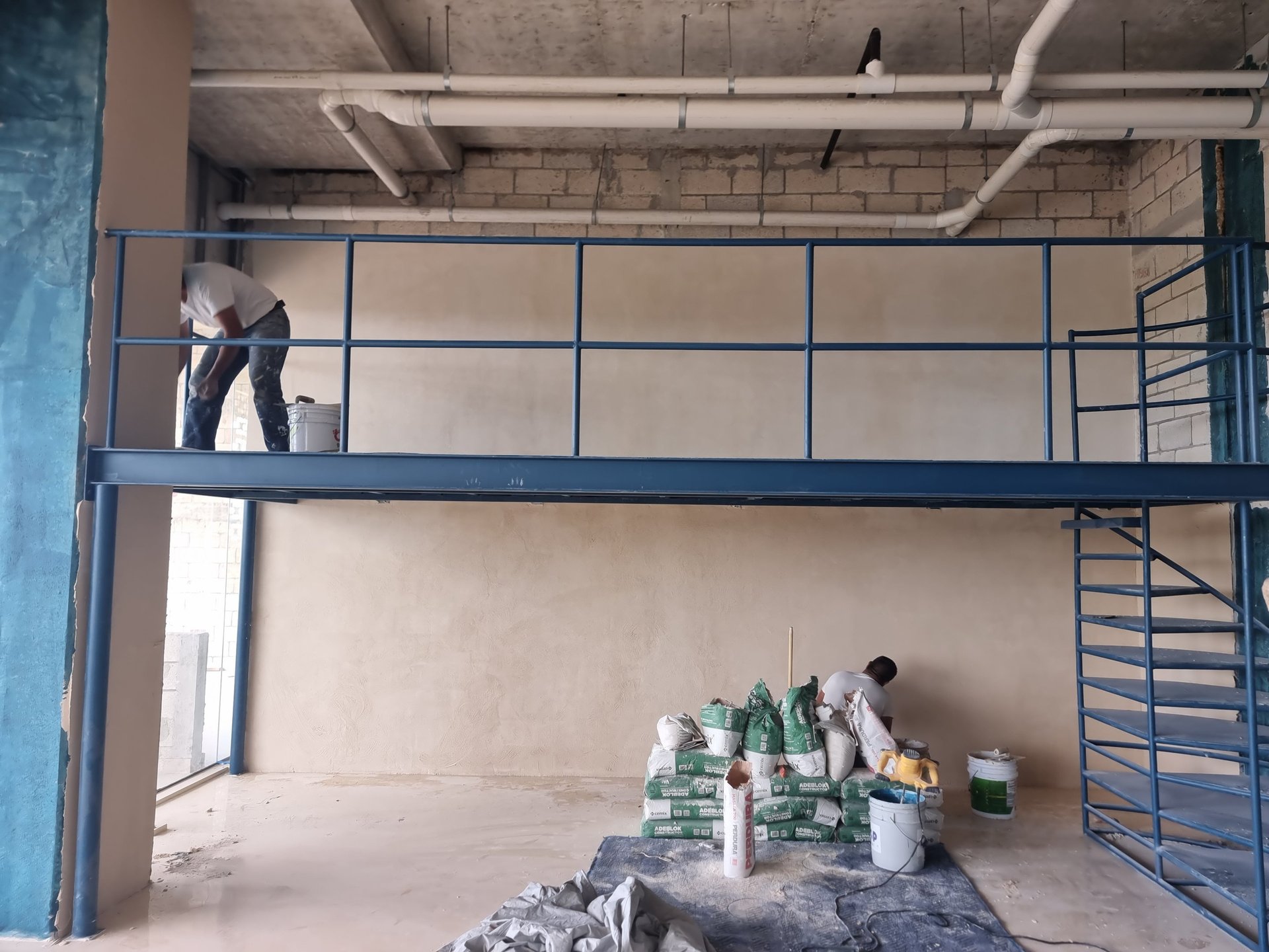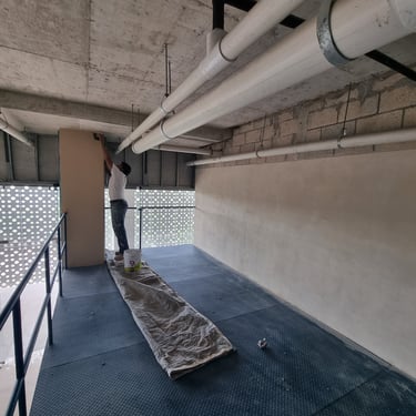 Se realizó la preparación, resane y sellado técnico de los muros en bruto, aplicando un acabado de alta resistencia y baja porosidad que maximiza la iluminación y asegura una transición estética impecable con el nuevo piso epóxico y la estructura de herrería.